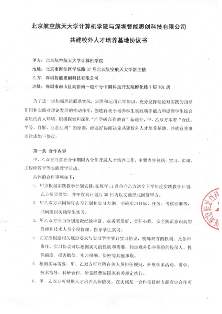 9月13日,智能3499拉斯维加斯官网与北京航空航天大学签订了共建校外人才基地协议。双方同意在合作期限内合作开展人才培养工作,主要内容包括∶实习、实训、工程师教育等实践教学活动,积极探索和深化“产学研合作教育”新途径。